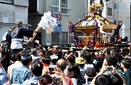 千住神社の千貫神輿が北千住西口駅前ロータリーに入り込み14時から30分間の神輿揉み御披露です。 |