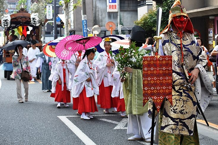 本格的な渡御列を組む。先導の神職は白馬に騎乗、鉄棒、猿田彦、辻払い神職、舞姫、囃子屋台、