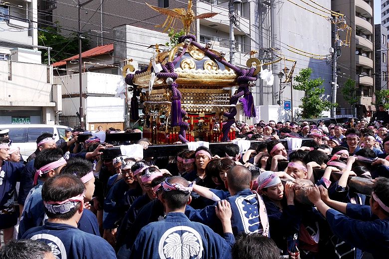 氏子青年会に担がれて根岸3丁目の金杉通りの宝泉湯前を悠然と渡御する小野照崎神社の宮神輿 |