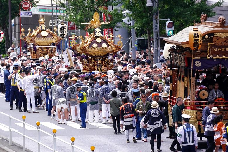 靖国通りの料亭玄海での休息後の山車に先導され二基連なって悠然と午後の渡御再開です |