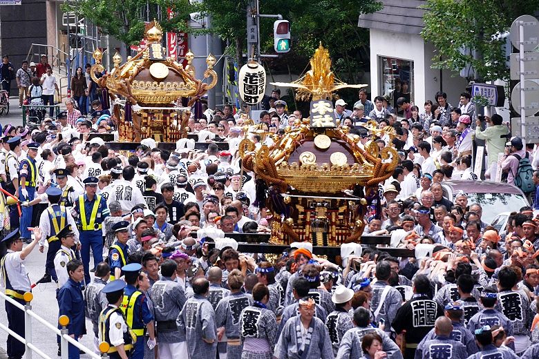 靖国通りの料亭玄海でから本社神輿と雷電神輿が連なって靖国通りを渡御 |