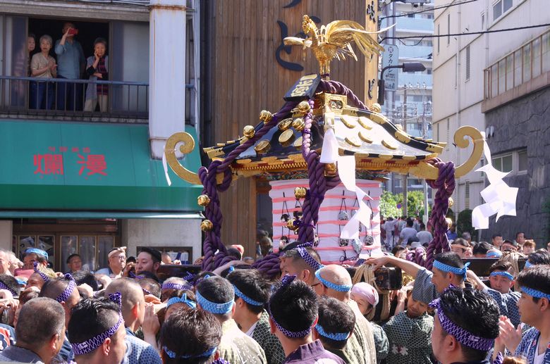 東武浅草駅前の花川戸の狭い路地中を激しい神輿揉み繰り返し渡御 |