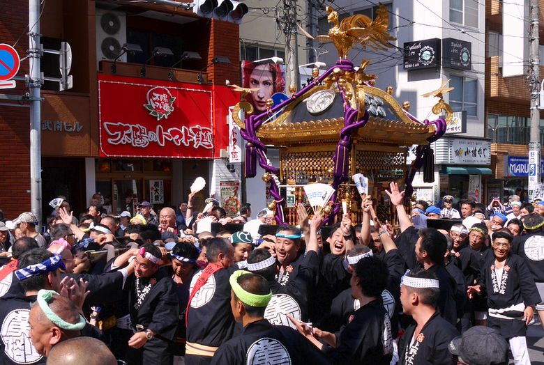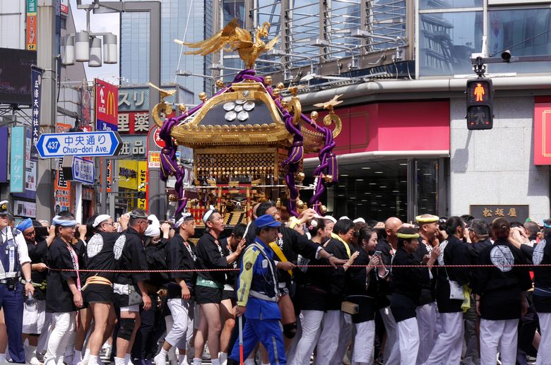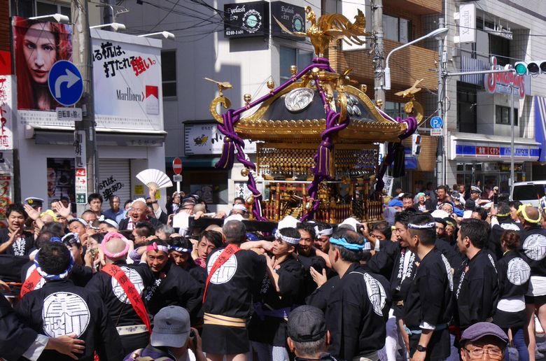 多くの担ぎ手に囲まれて上野広小路を威勢良い掛け声で |