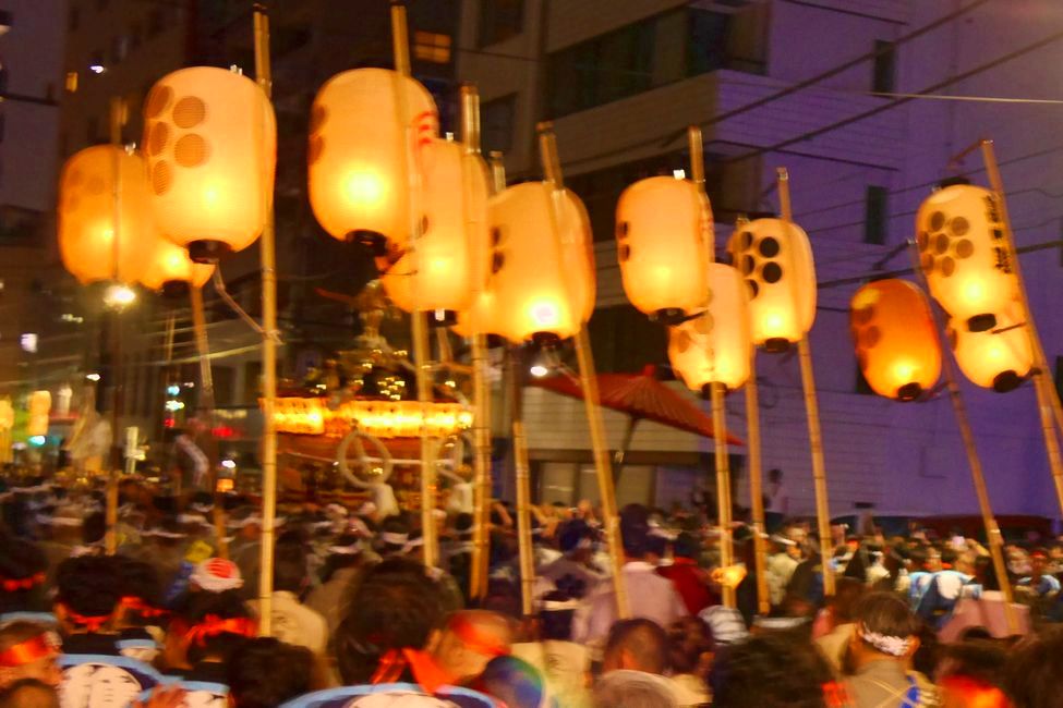 夕刻、神輿の弓張提灯と十八ケ町睦会の高張提灯に火が入ると祭りは最高潮を迎える。