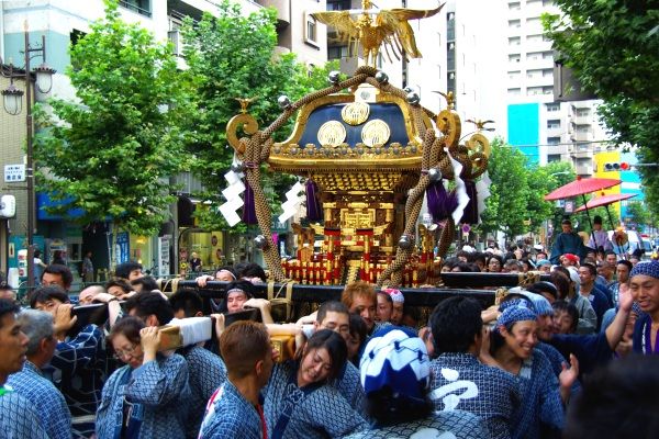 晴れ舞台の早稲田通りで鼻棒を女性が担ぐ粋な計らいの水稲荷神社 |