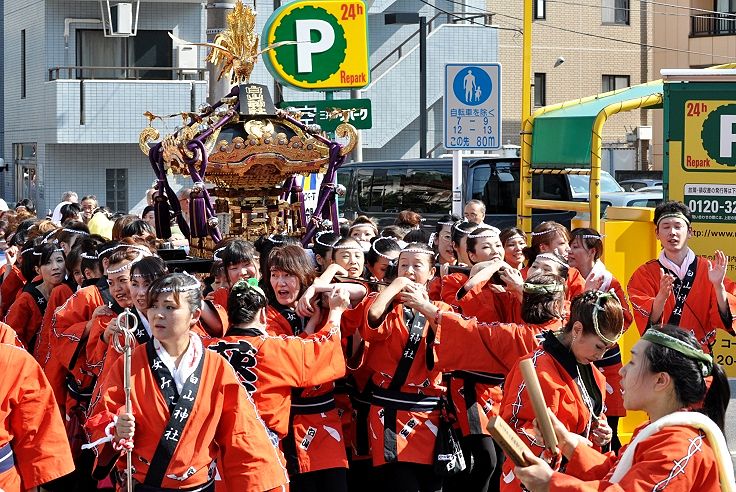 女神輿にアジア人も加わった賑やかな女性軍団の息もあった熱気の担ぎ |
