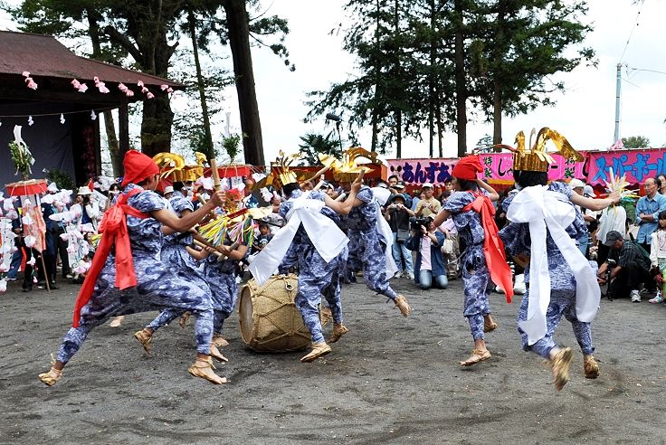 冠を被った白襷と赤い頭巾を被った赤襷とで重要無形民俗文化財の鳳凰の舞の奉納 |