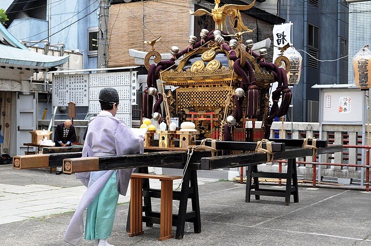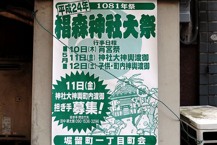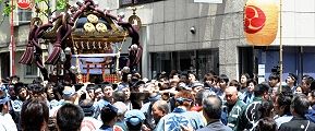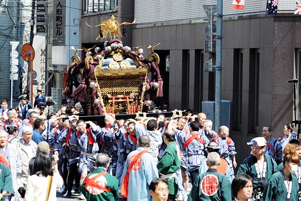 ビジネス街のため毎回平日の11日(金)の渡御。前年例大祭は地震のために今年に順延。 中央区日本橋堀留町1-10-2
