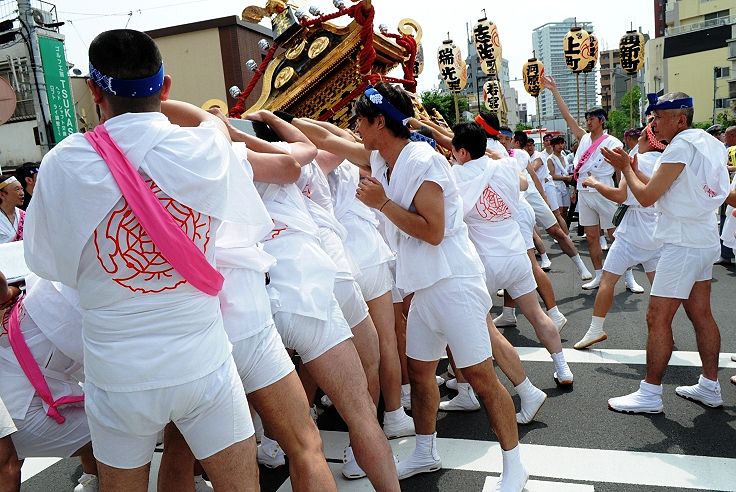 宮出しから歩行者天国の小塚原通りを神輿振り体勢の内側担ぎで悠然と渡御してくる |