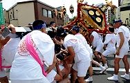 神輿を地面すれすれまで左右交互に倒し振り合います。大変荒々しく勇壮な情景です。