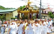 後方に太鼓と山車を引きつれ渡御。 |