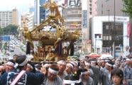 | 春日通りの東豊坂を唐破風軒屋根の宮神輿が登り始める |