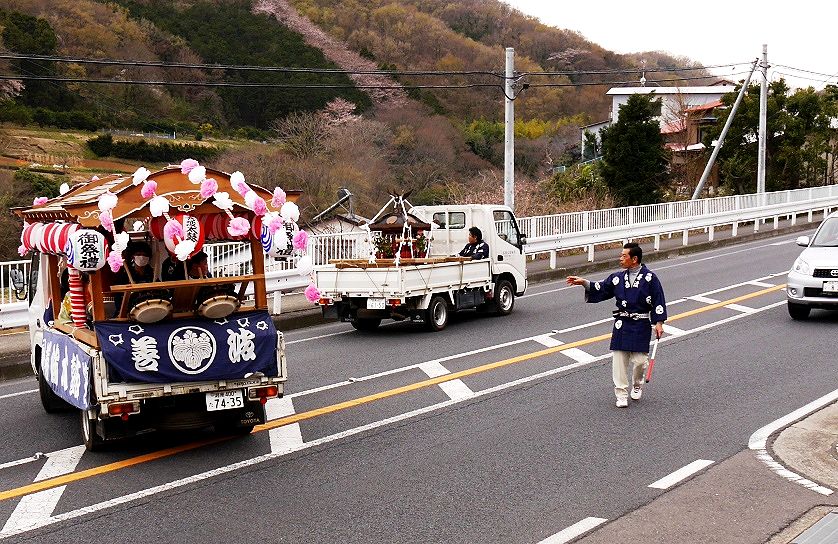 | 車載の子神輿がお囃子屋台と国道から谷戸周りへ |