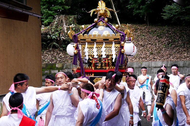 六時半から白装束の担ぎ手達が、宝暦10年 (1760)建造の本殿を三周して石段下の広い境内広場へと。 |