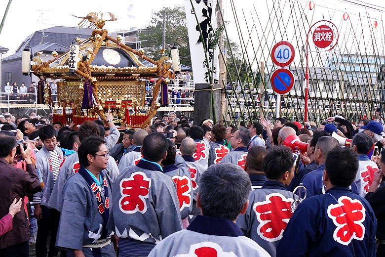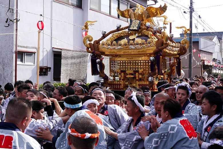 神揃場で「オリャア!」「ソリャア!」担ぎ手は各社で異なる掛け声を発し、他社に負けじと神輿を高く掲げたり、