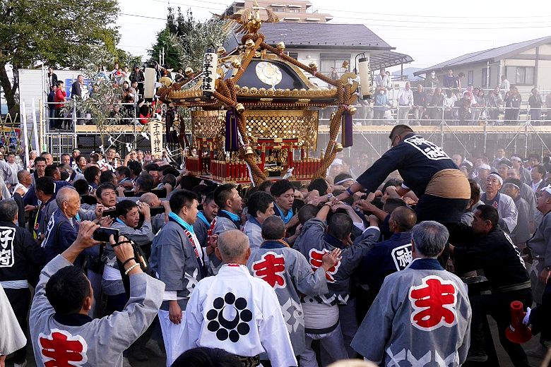 ヨイサ!オリャサ!の掛け声と居囃子に鼓舞されて連続の差し上げで囃子連に応える高津比盗_社 |