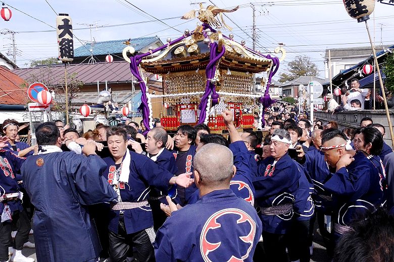 二宮神社参拝へと七曲がりを悠然と渡御していく大鳳凰載せた延軒屋根の菊田神社 |