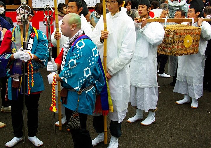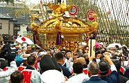 大観衆を押し分けるようにして神揃場から参拝昇殿に向かう子安神社 |