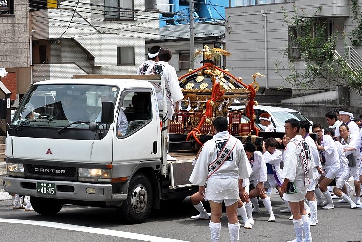 境内で揉み参道から宮出し後、バス道路を担出し、鶴見駅東口入口まで来ると、トラックに搭載移送です。