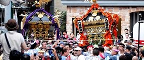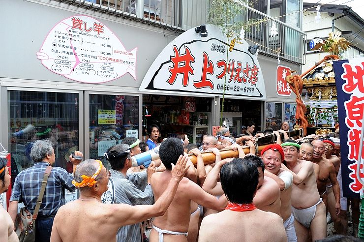江の島の夏祭りは二基が東浜と下町海岸での海中渡御と龍口明神社前の江の電通りを小動神社までを連合渡御です。