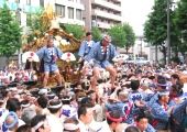 都心が賑やかな祭雰囲気に包まれます。其の内50基が一日かけて次々と神社へ宮入参拝する。