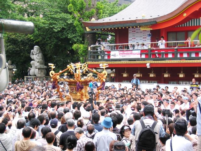 明神前の本郷通りは笛と掛け声と手拍子の担ぎ手達の人波の中を宮入参拝に向かう神輿と