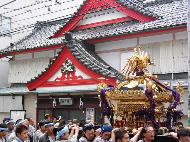 町内神輿の「蔵前中央神輿」が東京の銭湯では珍しい朱塗りの艶やかな千鳥破風の銭湯「梅の湯」