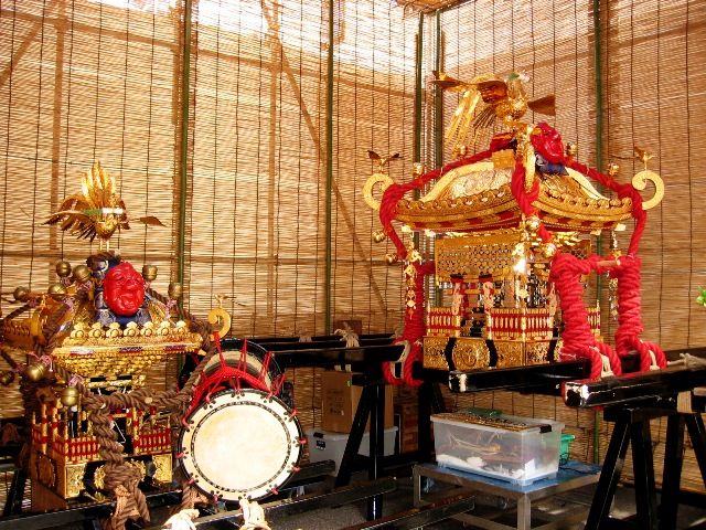 大神輿。 明治17年(1884)製造。2トンの千貫神輿で大正13年(1924)まで毎回渡御していたが