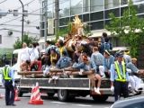 いまだ宮入渡御中の神輿とすれ違うと車上からは大拍手と頑張れよ!と情熱の声援が後押しする。 |