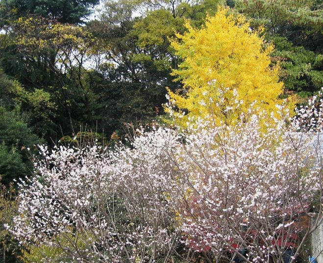 のやっと秋のイチョウが黄葉したというのに まめ櫻は早や満開でイチョウとの珍しい風景です。 今年のイチョウの黄葉は全国的に遅れているのです。 地球温暖化や都市のヒートアイランド現象で9〜10月の高温と冷え込み不足の結果なのです。