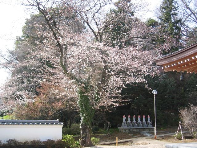 清水寺の佇む地蔵達と向き合うさくら。町田街道沿いの清水寺参道脇の一本桜。町田市相原町701。