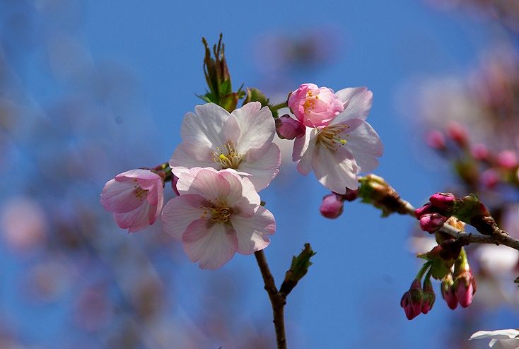 葉の芽が開くほぼ同時に花を咲かせる。蕾の色は紅色で花径は25〜35ミリくらいの一重の中輪である。